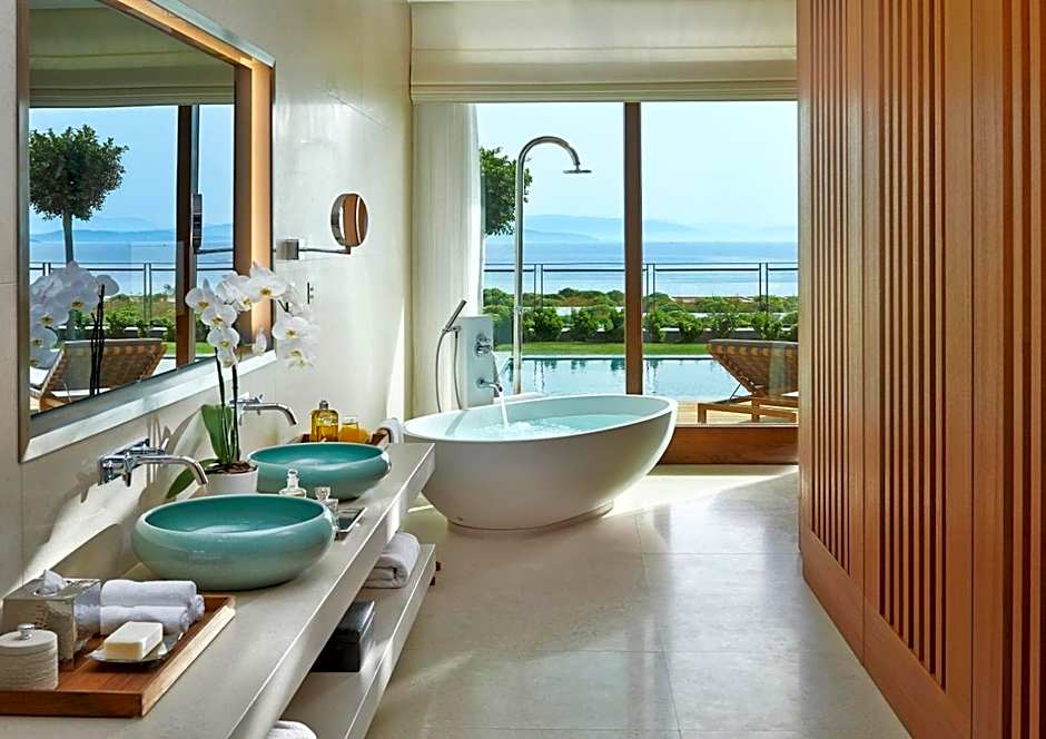 This triple room features a private pool. Featuring free toiletries and bathrobes, this triple room includes a private bathroom with a walk-in shower, a bath and a bidet. The spacious air-conditioned triple room features a flat-screen TV, a tea and coffee maker, a seating area, a wardrobe as well as sea views. The unit has 1 bed.